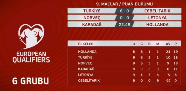 Grup diğer maçlarında Norveç, Letonya ile 0-0 berabere kaldı. Hollanda ise Karadağ ile saat 22.45’te karşı karşıya gelecek.