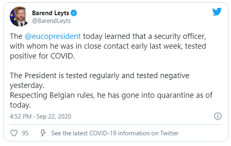 Charles Michel’in sözcüsü Barend Leyst, Twitter’dan yaptığı açıklamada, Konsey Başkanı Michel’in Covid-19 testi pozitif çıkan bir güvenlik görevlisi ile yakın temasta olması nedeniyle yürürlükte olan kurallar NEDENİYLE kendisini karantinaya aldığını paylaştı.