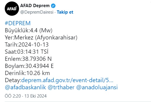 Afyonkarahisar’da gece 03:14’te meydana gelen deprem, şehir merkezinde paniğe yol açtı. 4.4 büyüklüğündeki deprem, birçok bölgeden hissedildi.