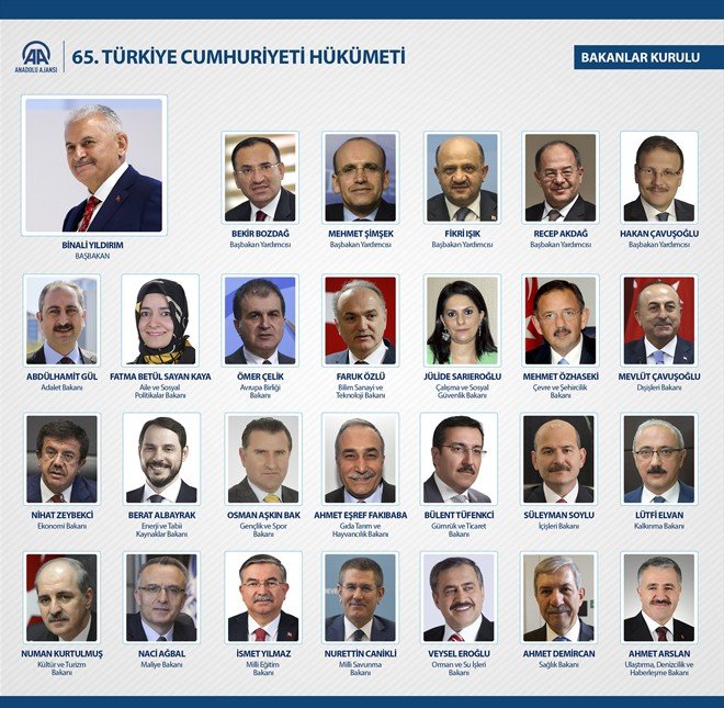65. Hükümet’te yapılan değişiklikleri açıklayan Başbakan Binali Yıldırım, yeni isimlerden oluşan Bakanlar Kurulunun hayırlı ve uğurlu olmasını diledi.