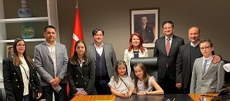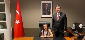 İlkokul 5. sınıf öğrencileri Yusuf Erilli ve Zehra Gülal ile birlikte Başkonsolosluğa gelen 11 yaşındaki İlkokul 6. sınıf öğrencisi Tuana Ulutaş, Başkonsolos Deniz’in koltuğunu bir süre devraldı.