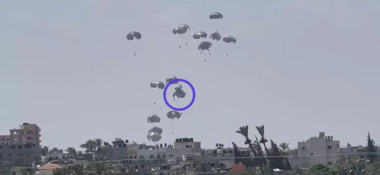 Savunma Bakanlığı sözcüsü, 16 gıda paketine bağlanan paraşütlerin tamamının açıldığını, iniş sırasında yaşanan çarpışma nedeniyle bir paraşütün beklenenden daha hızlı bir şekilde iniş yaptığını açıkladı.