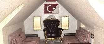 Ofisin duvarında asılı bir Türk bayrağının yanı sıra muhtemelen mafya babasına ait bir tahtın da bulunduğu görülüyor.
