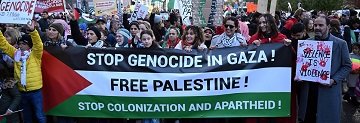 Avrupa’da faaliyet gösteren 40’tan fazla sivil toplum örgütü, sendika ve yardım kuruluşunun düzenlediği, Brüksel’de son yılların en kalabalık gösterilerinden biri olan yürüyüşte, “Filistin’e özgürlük”, “Katil İsrail”, “Acil ateşkes” şeklinde sloganlar atıldı.
