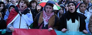 Göstericiler, Avrupa ülkelerinden İsrail’e boykot uygulamasını, silah satışını kesmesini talep etti ve İsrail’i Filistinlilere soykırım uygulamakla suçladı.