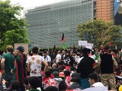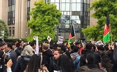 Afganistan bayrakları taşıyan yaklaşık 300 kişi, Avrupa Birliği (AB) Komisyonu önündeki Schuman Meydanı’nda bir araya geldi.