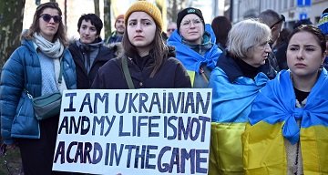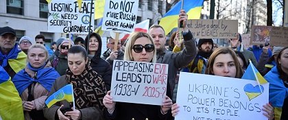 Ukrayna bayrakları taşıyan kalabalık, “Trump, Putin’e hizmet ediyor”, “Ukrayna satılık değildir” ve “Düşmanınızın söylemini benimseyerek bir anlaşma yapamazsınız” yazılı pankartlar taşıdı.