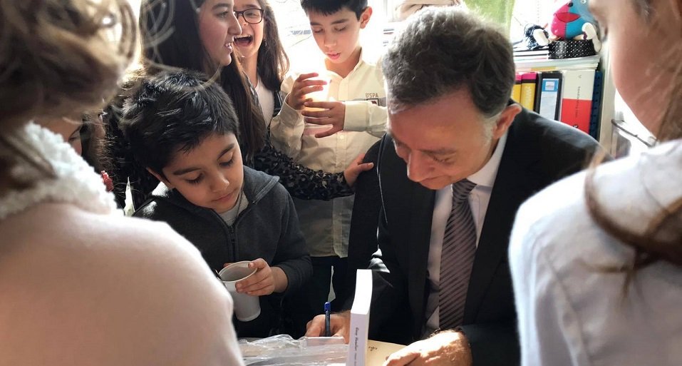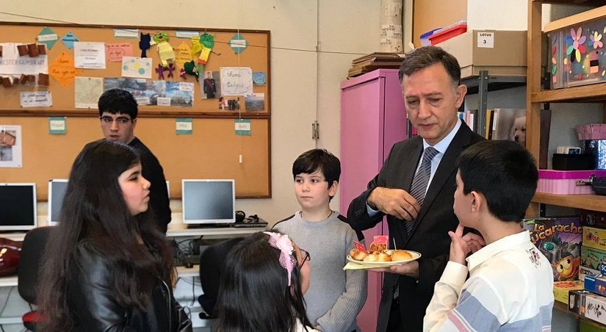 Büyükelçi Levent Gümrükçü, okul ziyaretinde öğrencilerin Türkçe söyledikleri şarkıları dinledi ve öğrencilere Türkçe kitap hediye etti.