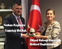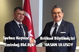 Bir dizi temas ve ziyaretlerde bulunmak üzere 18 Şubat 2020 Çarşamba günü Belçika’ya gelen Emirdağ Belediye Başkanı Serkan Koyuncu, ilk resmi ziyaretini T.C.Brüksel Büyükelçisi Hasan Ulusoy’a, ikinci resmi ziyaretini ise T.C. Brüksel Başkonsolosu Dilşad Kırbaşlı Karaoğlu’na yaptı.