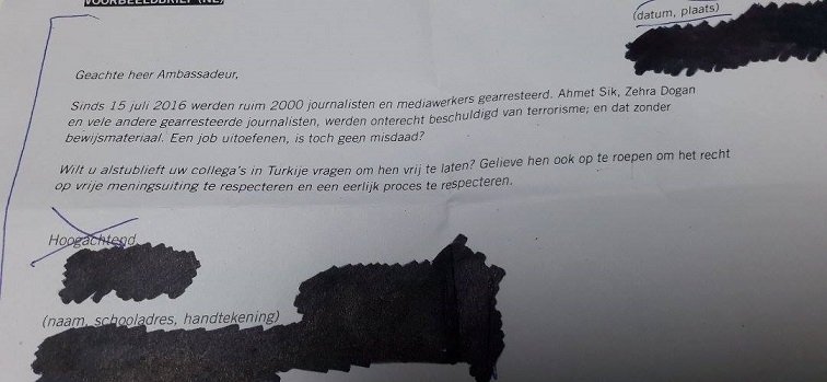 Bu skandal durumu Belemtürk’le paylaşan veliler, okulda bir sınıf öğretmeni tarafından dağıtılan yazı kağıtlarına, küçük öğrencilerden Türkiye’de tutuklu olan gazetecilerin serbest kalması için yazı yazmaları istendi ve daha sonrada bu kağıtlar sınıf öğretmeni tarafından Türkiye makamlarına iletilmek üzere toplandı.