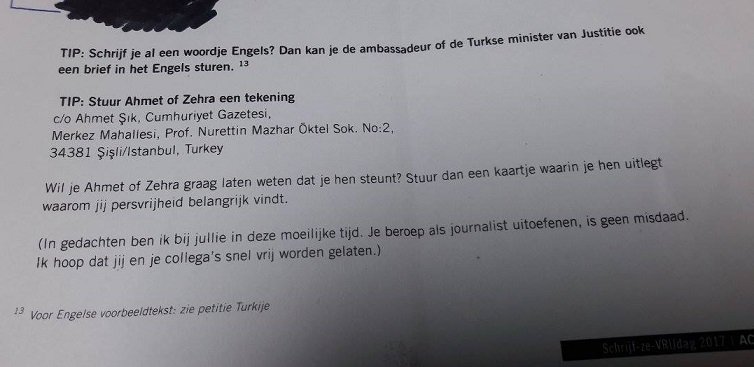 Skandalın bir diğeri ise, sınıftaki küçük öğrencilerden velilerine aynı dosya içerikli kağıtları ulaştırmaları ve Türkiye’de tutuklu gazeteciler Ahmet Şık ve Zehra Doğan’ın serbest kalması için yazı yazmaları istendi.