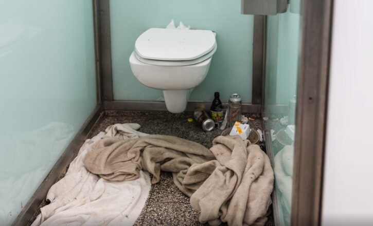İçeriye doğru ilerledikçe kendinizi tam bir savaş alanında buluyorsunuz. Her kabinde tuvalet kağıtları yerlere saçılmış, boş bira kutuları yerlere atılmış. Plastik şişeler ve diğer çöpler tuvalet klozetine atılmış ve kabin kapıları idrar lekeleriyle kaplı.