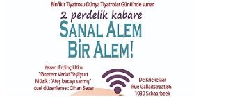 2008 yılından beri Belçika sahnelerinde Türkçe tiyatronun bayrağını gururla dalgalandıran ve geleceğin sanatçılarının gözlerindeki ışıltıyı sahne ışıklarıyla buluşturan Binfikir Tiyatrosu, 27 Mart Dünya Tiyatrolar Günü’nde çağın hastalığı “akıllı telefon ve sosyal medya bağımlılığı”nı “Sanal Alem Bir Alem!” adlı 2 perdelik kabare ile Brüksel’de sahneye taşıyor.