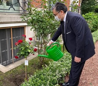 Anma günü kapsamında Büyükelçi Ulusoy, 15 Temmuz şehitleri anısına Büyükelçilik Resmi Konutu bahçesine dikilen gül fidanına can suyu verdi.