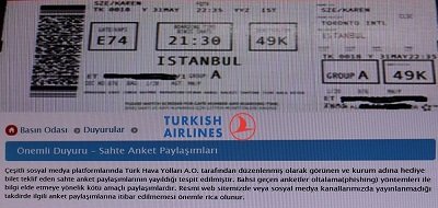 Gün boyunca farklı sosyal medya sayfalarında, “Türk Hava Yolları 84. Yıldönümü nedeniyle herkese 2 ücretsiz bilet veriyor” başlığı altında yapılan sahte anket paylaşımlarını yalanlayan Türk Hava Yolları, resmi web sitesinden bir basın duyurusu yayınlayarak, “bunlar bilgi elde etmeye yönelik kötü amaçlı paylaşımlardır. Resmi web sitemizde veya sosyal medya kanallarımızda yayınlanmadığı takdirde ilgili anket paylaşımlarına itibar edilmemesi önemle rica olunur” açıklamasında bulundu.