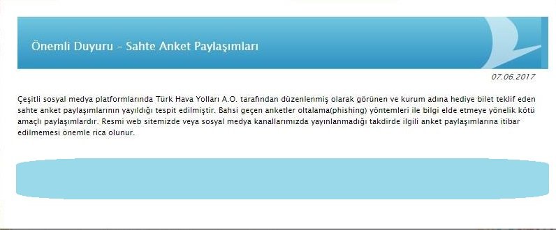 Çeşitli sosyal medya platformlarında Türk Hava Yolları A.O. tarafından düzenlenmiş olarak görünen ve kurum adına hediye bilet teklif eden sahte anket paylaşımlarının yayıldığı tespit edilmiştir. Bahsi geçen anketler oltalama(phishing) yöntemleri ile bilgi etmeye yönelik kötü amaçlı paylaşımlardır. Resmi web sitemizde veya sosyal medya kanallarımızda yayınlanmadığı takdirde ilgili anket paylaşımlarına itibar edilmemesi önemle rica olunur.