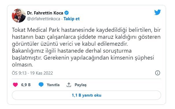 “Tokat Medical Park hastanesinde kaydedildiği belirtilen, bir hastanın bazı çalışanlarca şiddete maruz kaldığını gösteren görüntüler üzüntü verici ve kabul edilemezdir. Bakanlığımız ilgili hastanede derhal soruşturma başlatmıştır. Gerekenin yapılacağından kimsenin şüphesi olmasın.”