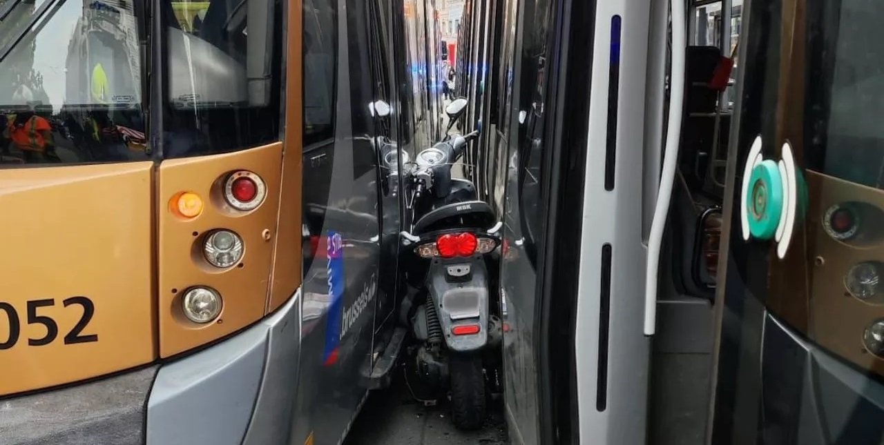 Belçika’nın başkenti Brüksel’de motosiklet sürücüsü iki tramvay arasına sıkıştı