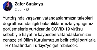 Sırakaya yaptığı yazılı açıklamada, “Yurt dışında yaşayan vatandaşlarımızın talepleri doğrultusunda ilgili bakanlıklarımızla yaptığımız görüşmeler sonucunda yurt dışında Kovid-19 virüsü sebebiyle hayatını kaybeden vatandaşlarımızın cenazeleri, Bilim Kurulumuzun belirlediği şartlarla Türk Hava Yolları tarafından Türkiye’ye getirebilecek.” ifadelerine yer verdi.